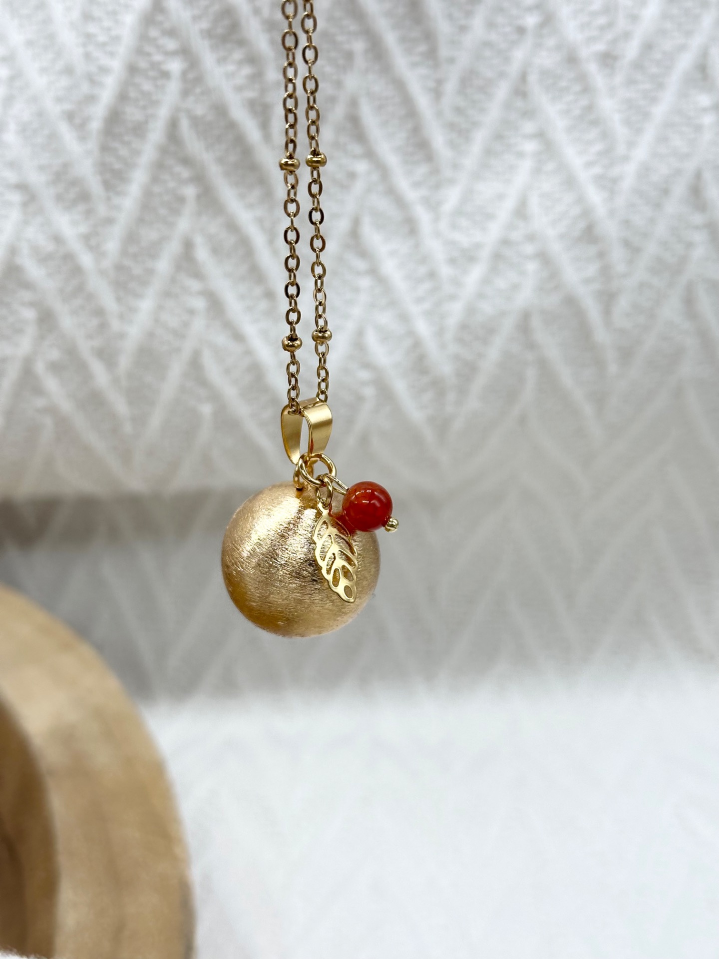 La longueur de la chaîne fourni avec votre bola est de 100 cm (ajustable sur toutes demandes) avec une chainette d'extension de 10 cm qui vous permet de l'adapter tout au long de votre grossesse. Ainsi, il peut en permanence reposer sur votre ventre même lorsqu'il devient très rond et être au plus proche de votre nombril.