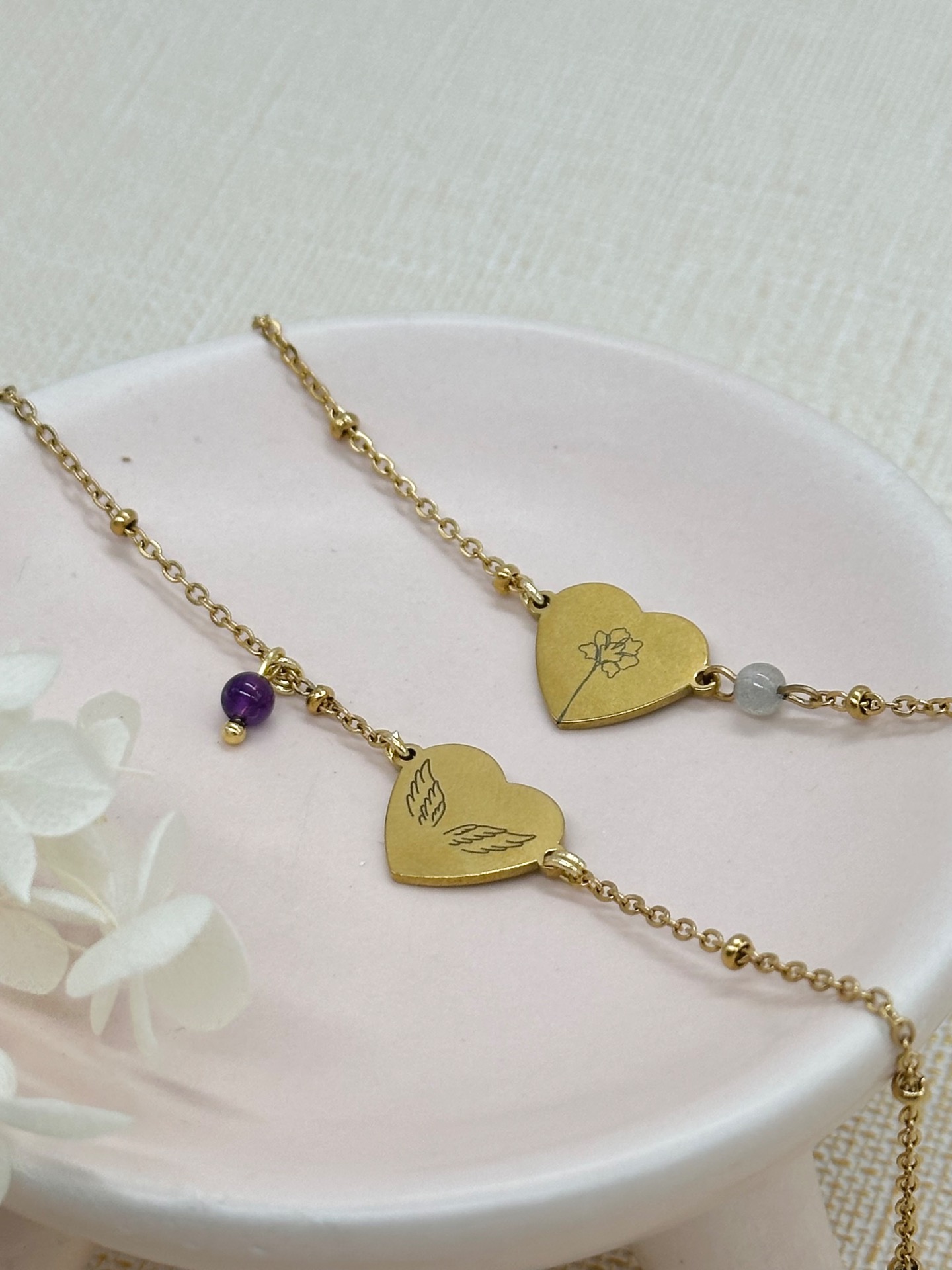 Bracelet Or avec pendentif en forme de coeur gravé et pierre
