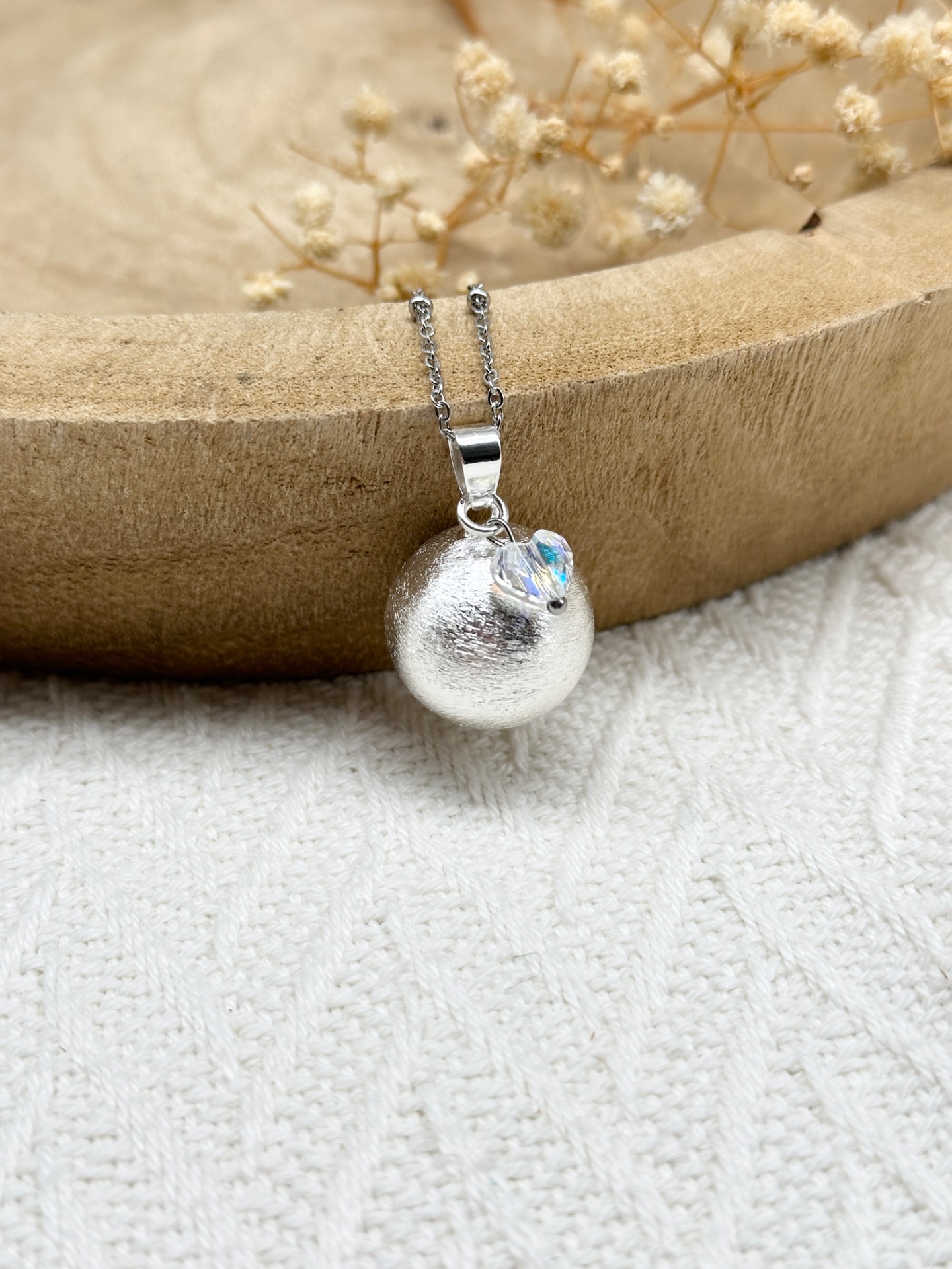 Bola de grossesse de la collection argent (lisse, brossé, fleuri au choix) accompagné d'un cœur taillé en cristal.