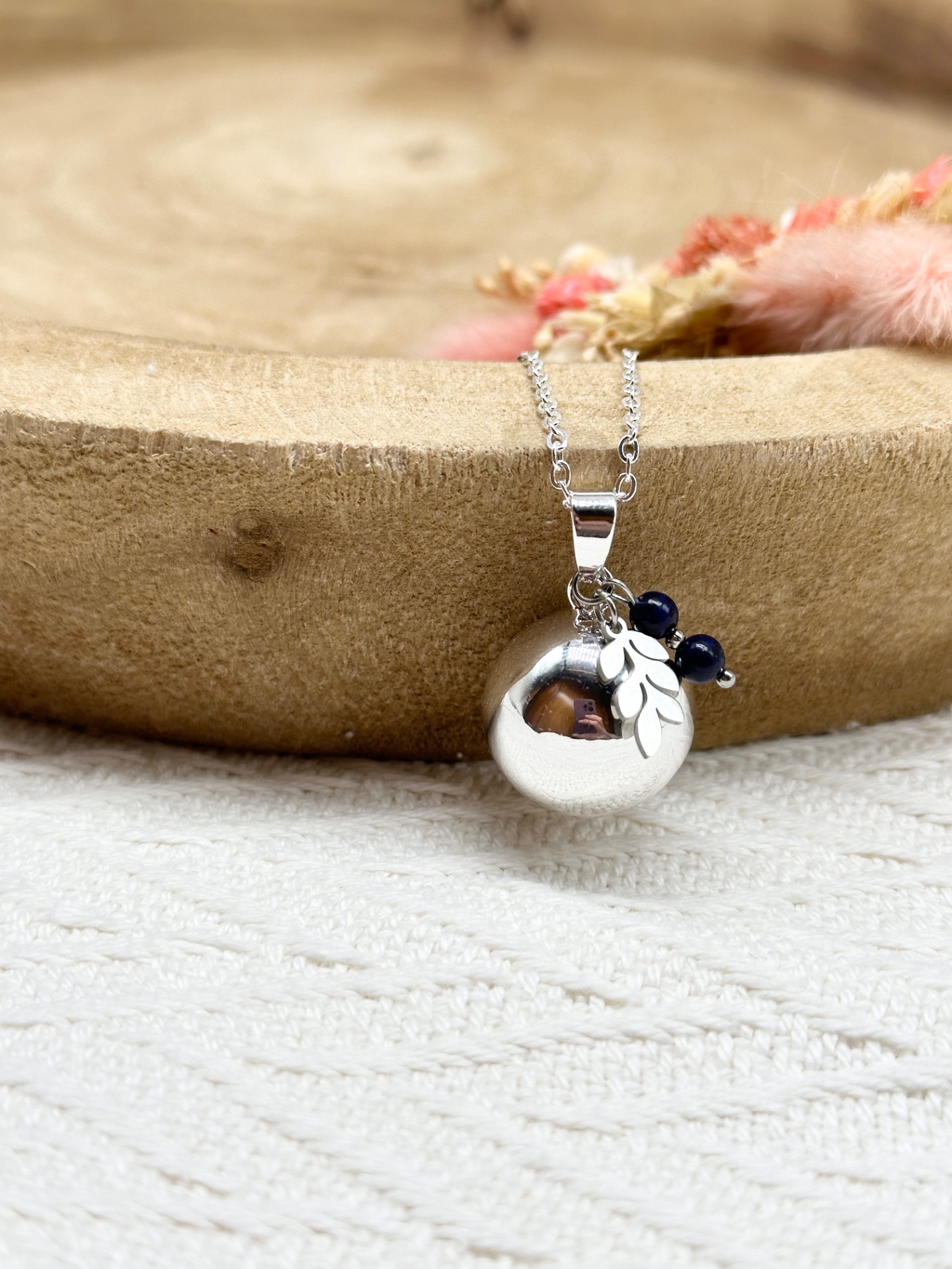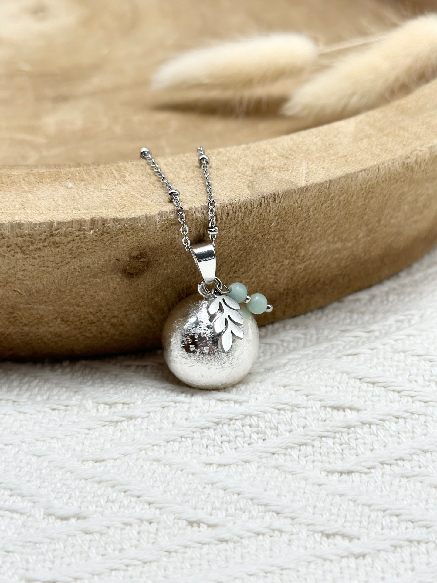 Bola de grossesse Argent (brossé ou lisse au choix) accompagné d'un délicat pendentif Feuille et de deux petites perles de 4mm au choix parmi près de 15 pierres (notre "Guide des pierres" est disponible dans les photos pour voir la couleur de chaque pierre et ses vertus).