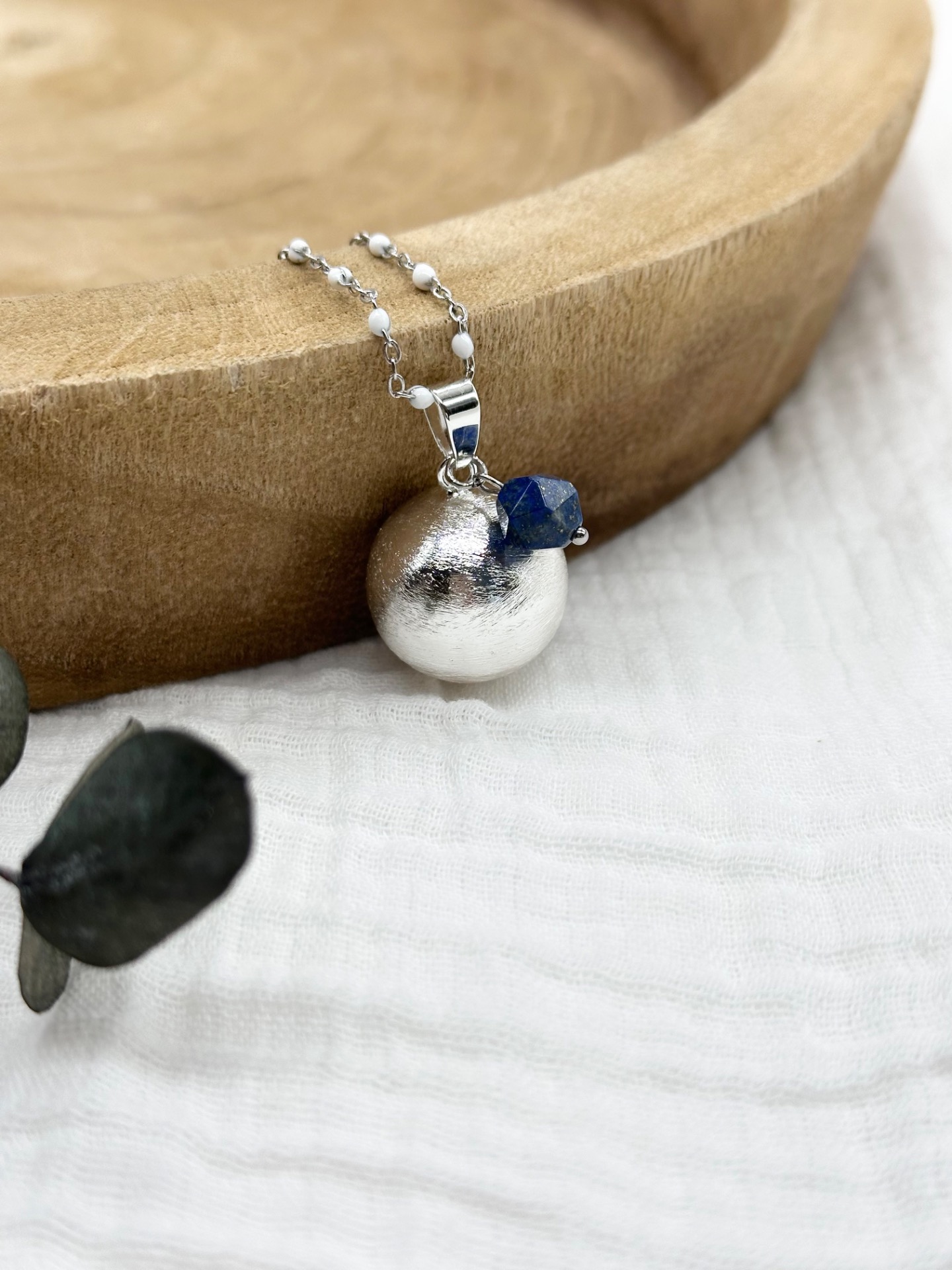 Bola de grossesse collection Argent (lisse, brossé ou fleuri au choix) accompagné d'une perle hexagonale en pierre naturelle au choix parmi près de 7 pierres (notre "Guide des pierres" est disponible dans les photos pour voir la couleur de chaque pierre et ses vertus).