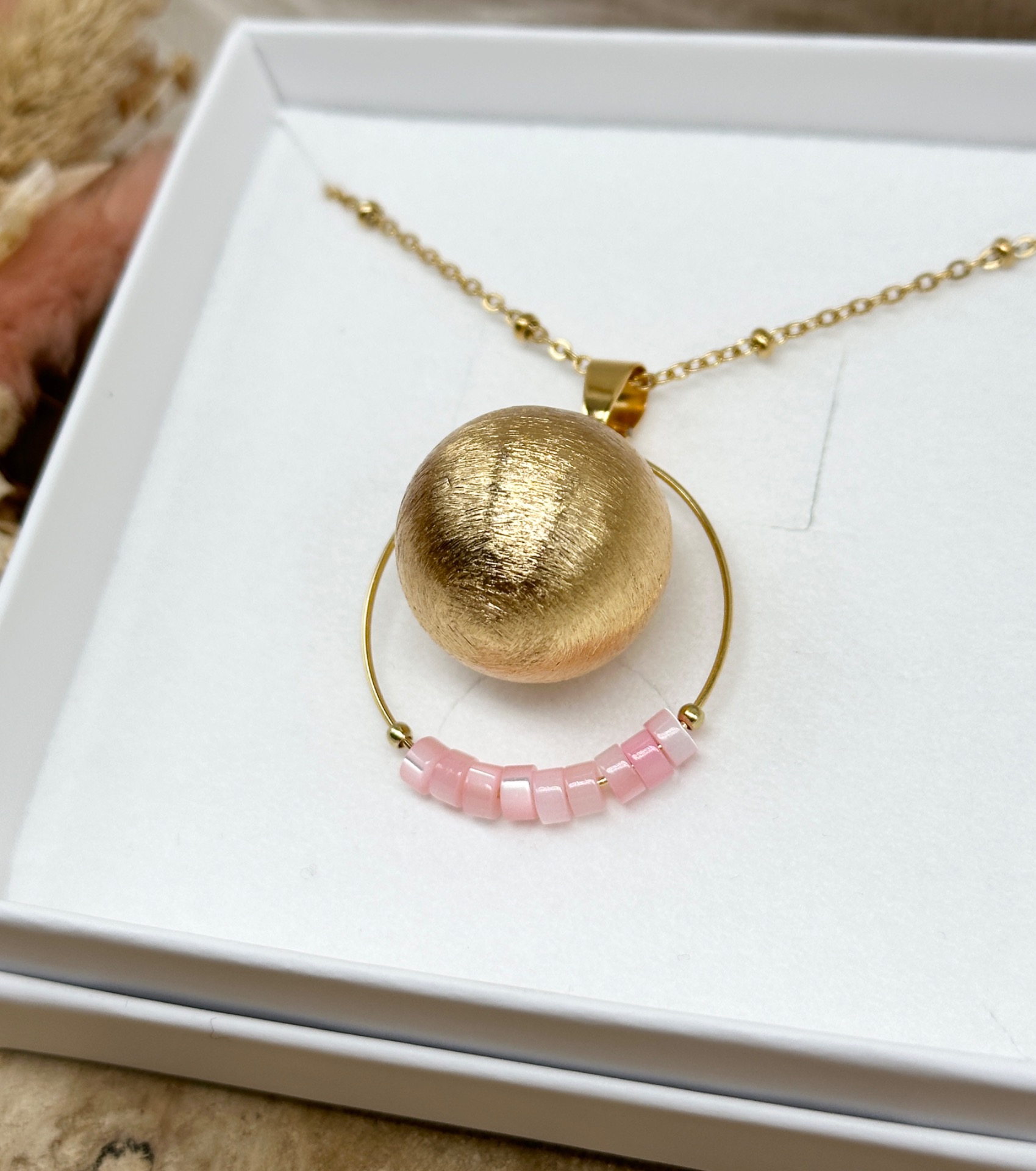 Bola de grossesse collection Or (lisse ou brossé) accompagné d'un anneau lisse avec 9 perles dite "Heishi" en nacre (5 coloris au choix).
