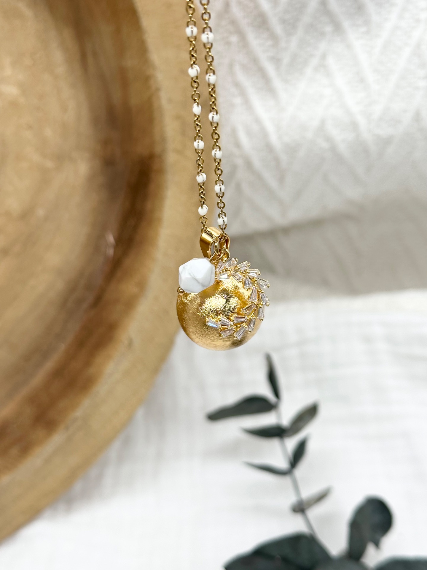 Bola de grossesse collection Or (brossé ou lisse au choix) accompagné d'un pendentif doré en croissant de Lune en plaqué or entièrement diamanté avec une perle hexagonale au choix parmi 7 pierres (notre "Guide des pierres" est disponible dans les photos pour voir la couleur de chaque pierre et ses vertus).