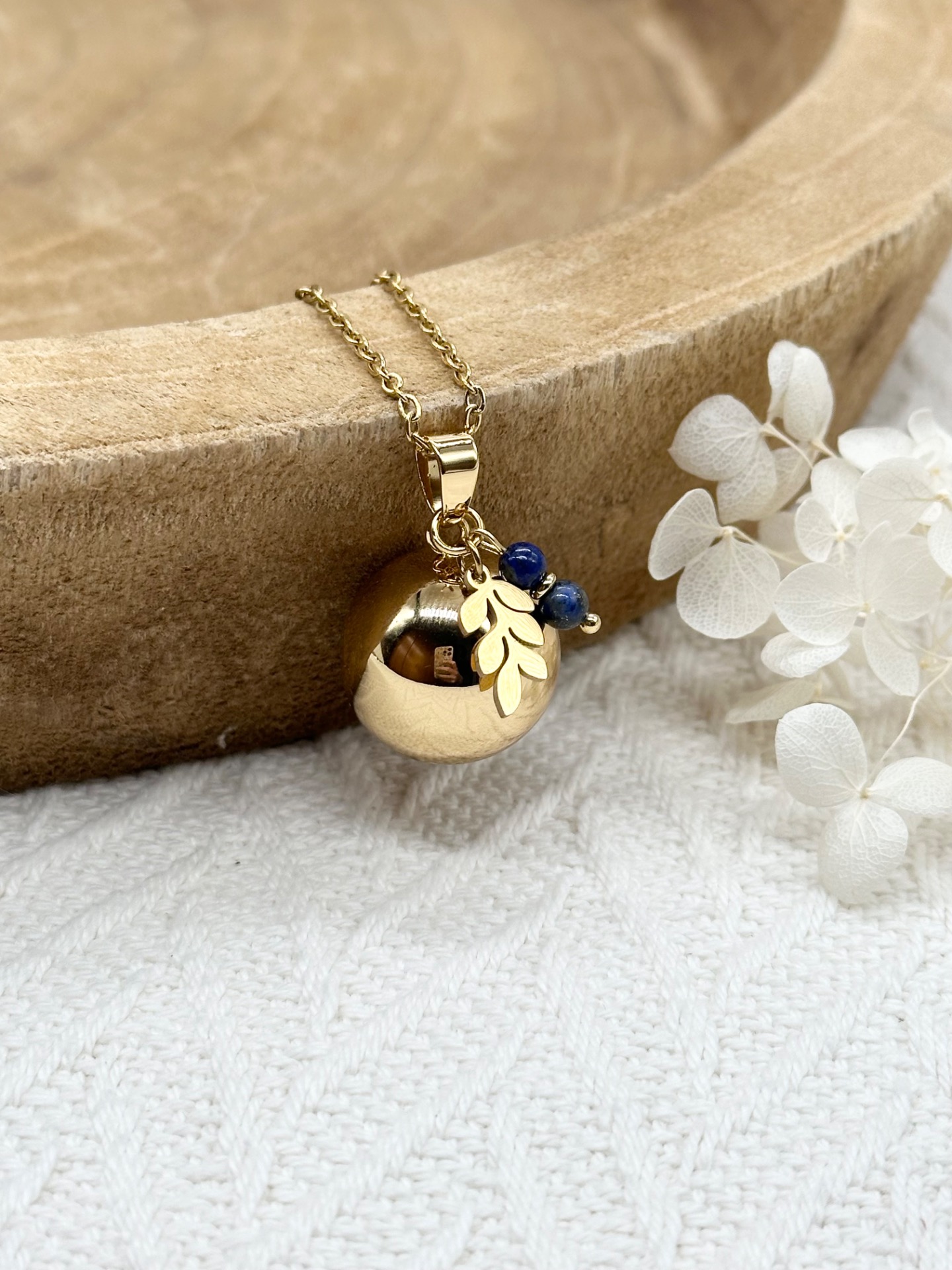 Bola de grossesse Or (brossé ou lisse au choix) accompagné d'un délicat pendentif Feuille et de deux petites perles de 4mm au choix parmi près de 15 pierres (notre "Guide des pierres" est disponible dans les photos pour voir la couleur de chaque pierre et ses vertus).