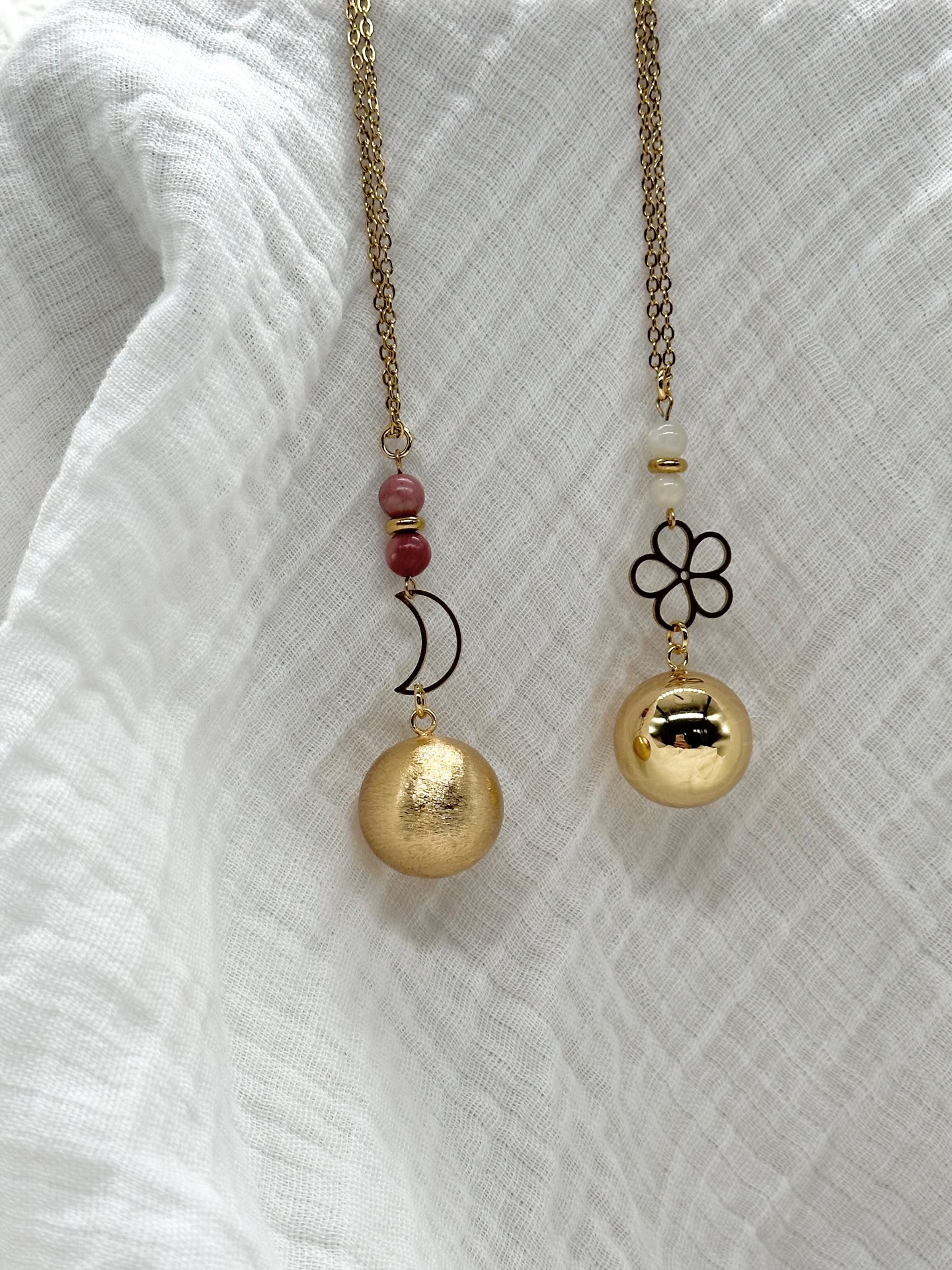 Bola de grossesse de la collection Or (finition brossé ou lisse) avec son pendentif (lune ou fleur) et ses perles au choix parmi près de 15 pierres (notre "Guide des pierres" est disponible dans les photos pour voir la couleur de chaque pierre et ses vertus).