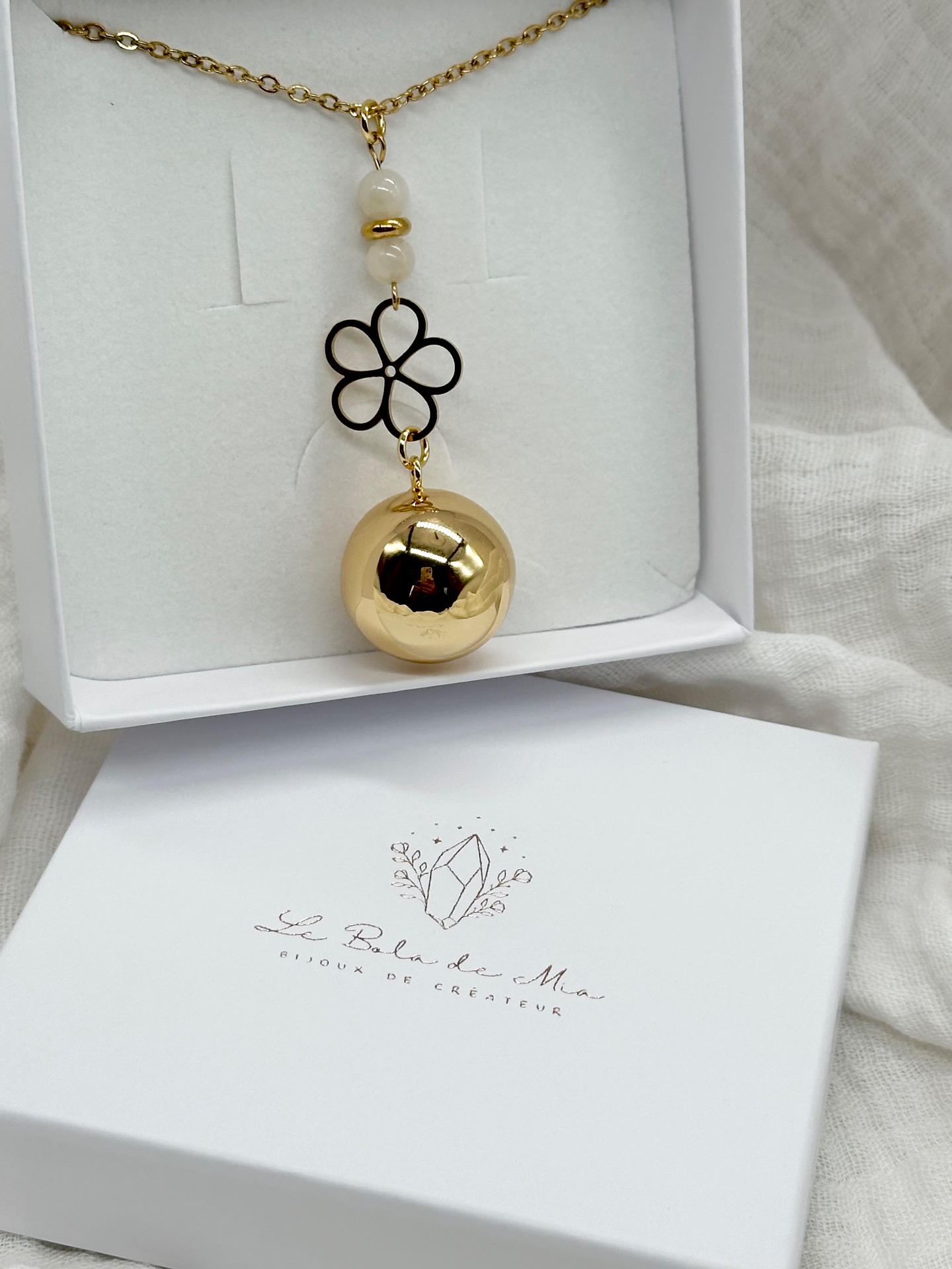 Envoi soigné dans un écrin de qualité, avec une lingette nettoyante type peau de chamois pour conserver l'éclat de votre bola le plus longtemps possible ainsi que nos conseils d'entretien, une carte de visite et une carte explicative "Made with Love".