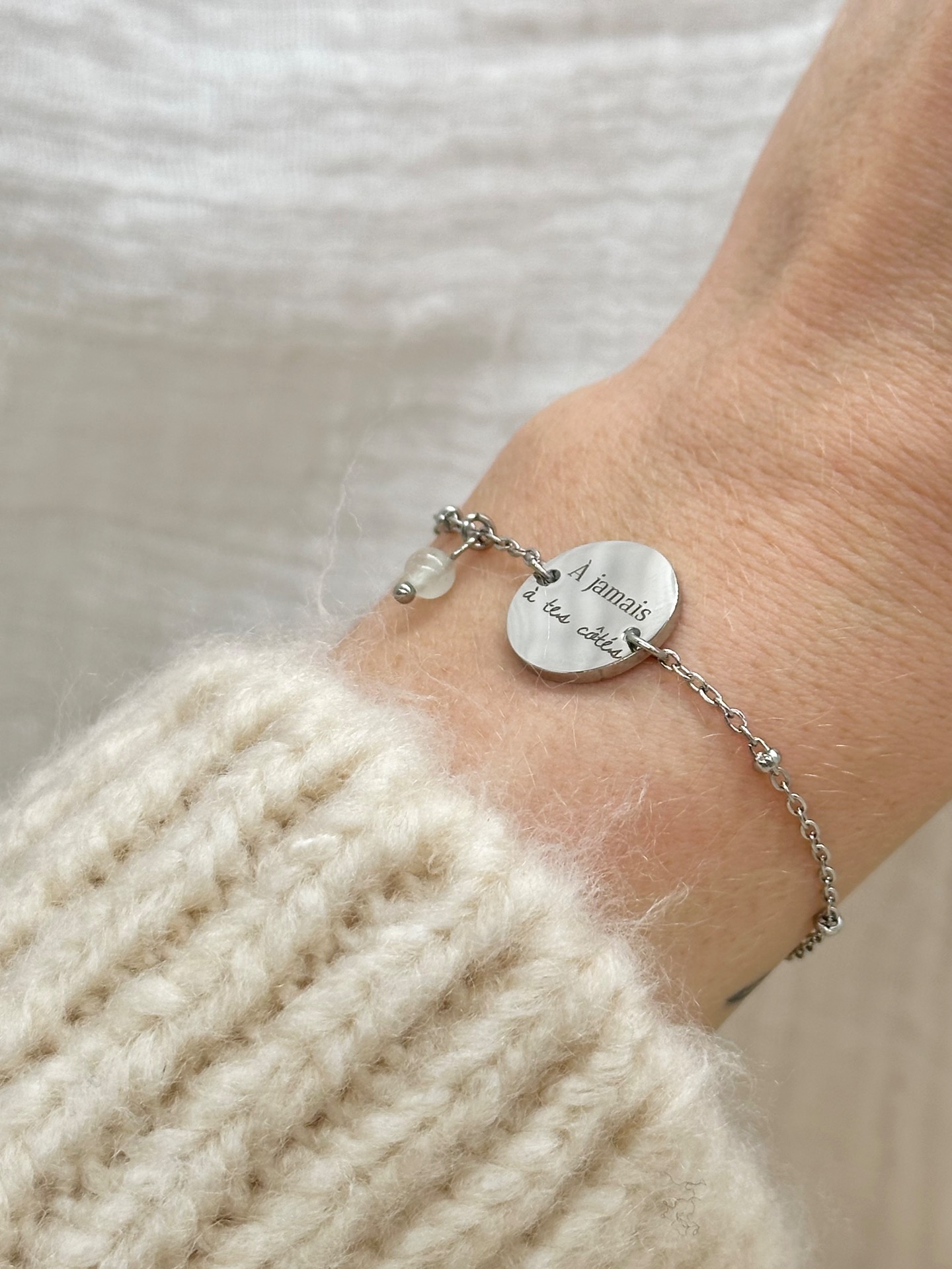 Bracelet en acier inoxydable avec un pendentif rond de 15 mm gravé ainsi qu'une pierre naturelle au choix.