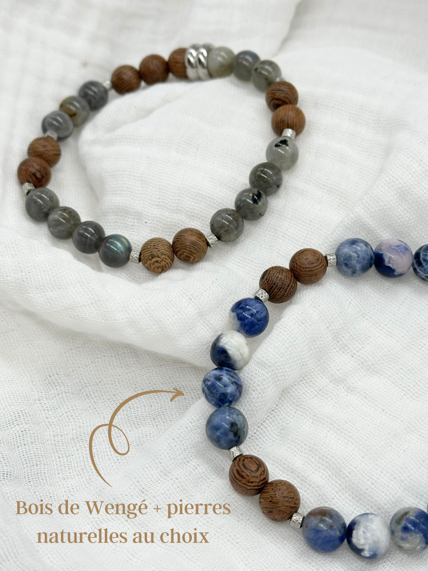 Bracelet composé de perles en bois de Wengé (bois marron foncé) + perles en pierres naturelles au choix (voir notre guide des pierres dans les photos).