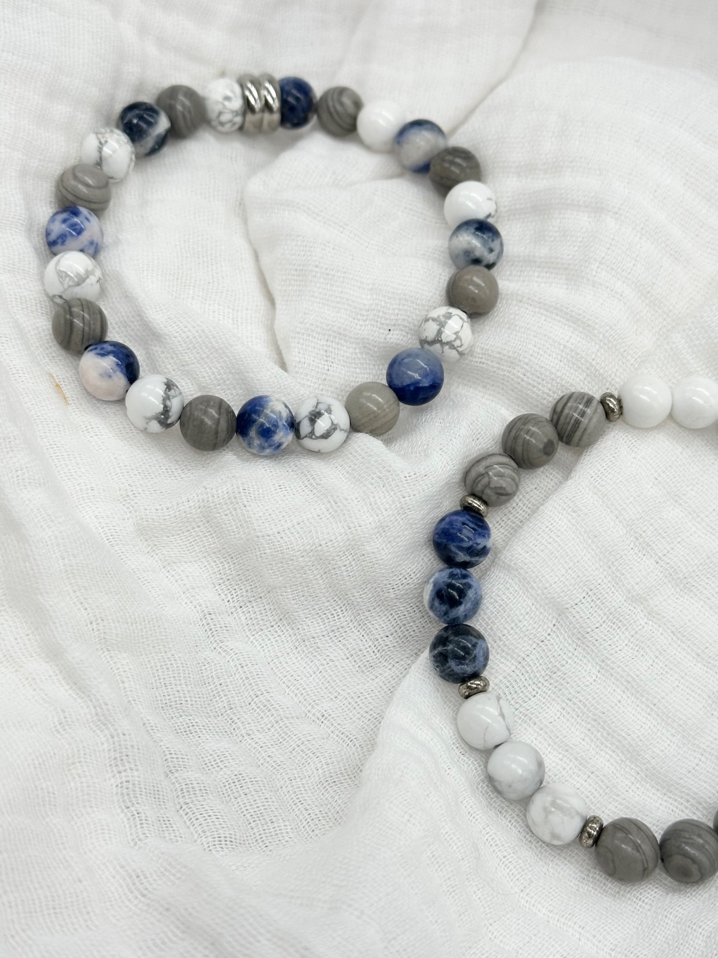 Bracelet composé de perles de Sodalite, de Howlite et de perles en bois gris résiné.