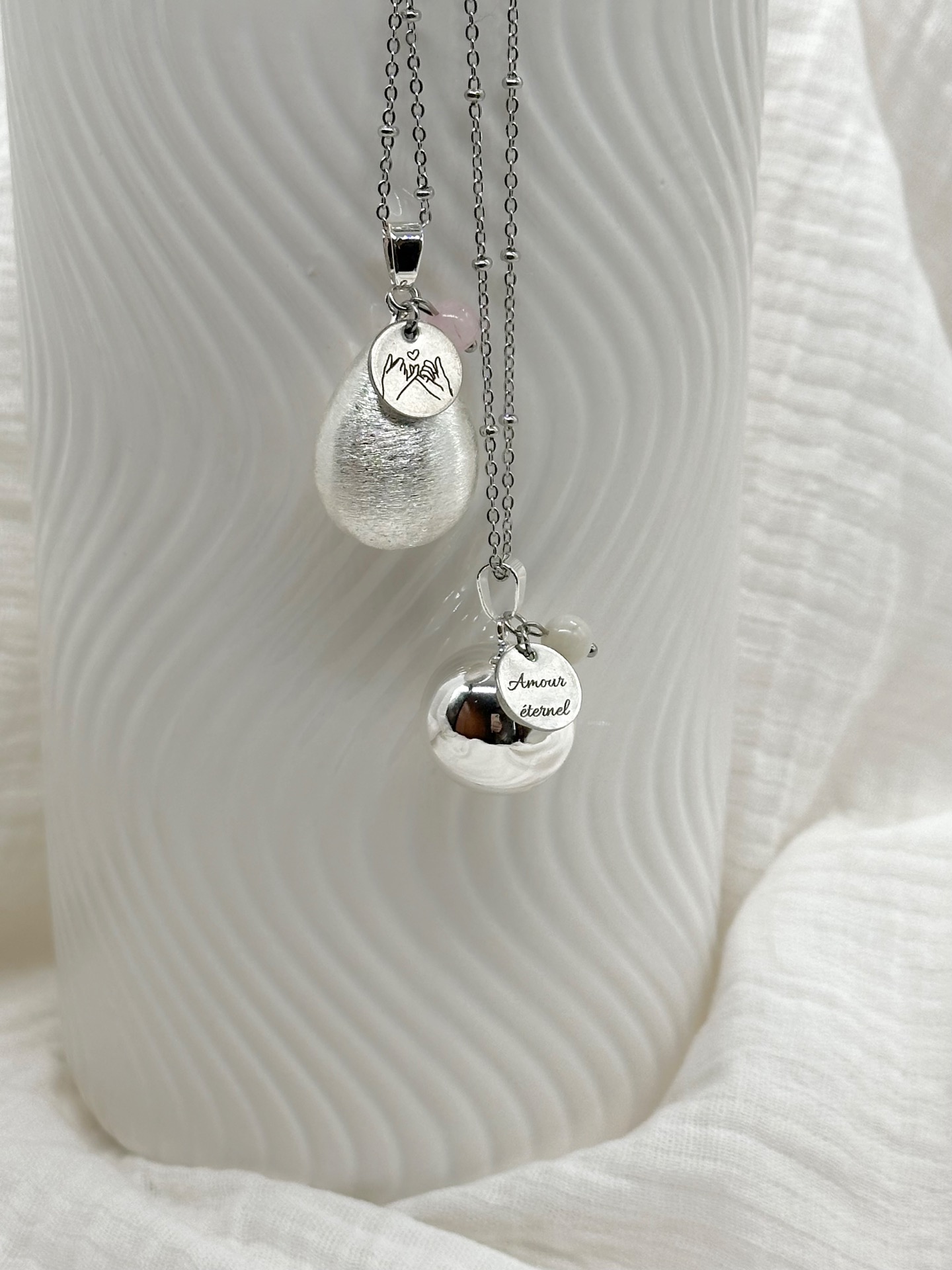 Bola de grossesse collection Argent avec un médaillon gravé ainsi qu'une pierre naturelle. Disponible en version rond ou en forme de goutte d’eau !