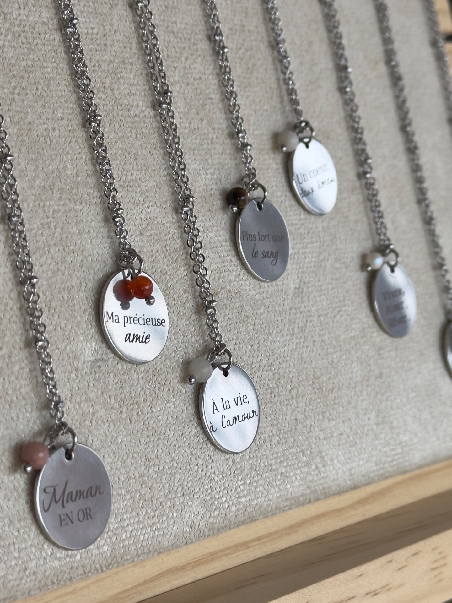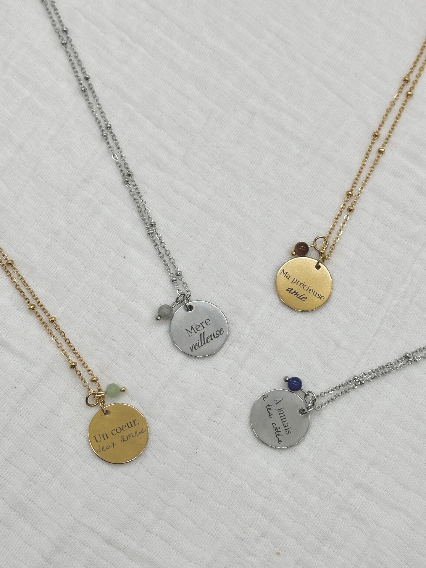 Collier argenté accompagné d'un médaillon de 18 mm avec une gravure ainsi qu'une pierre naturelle.