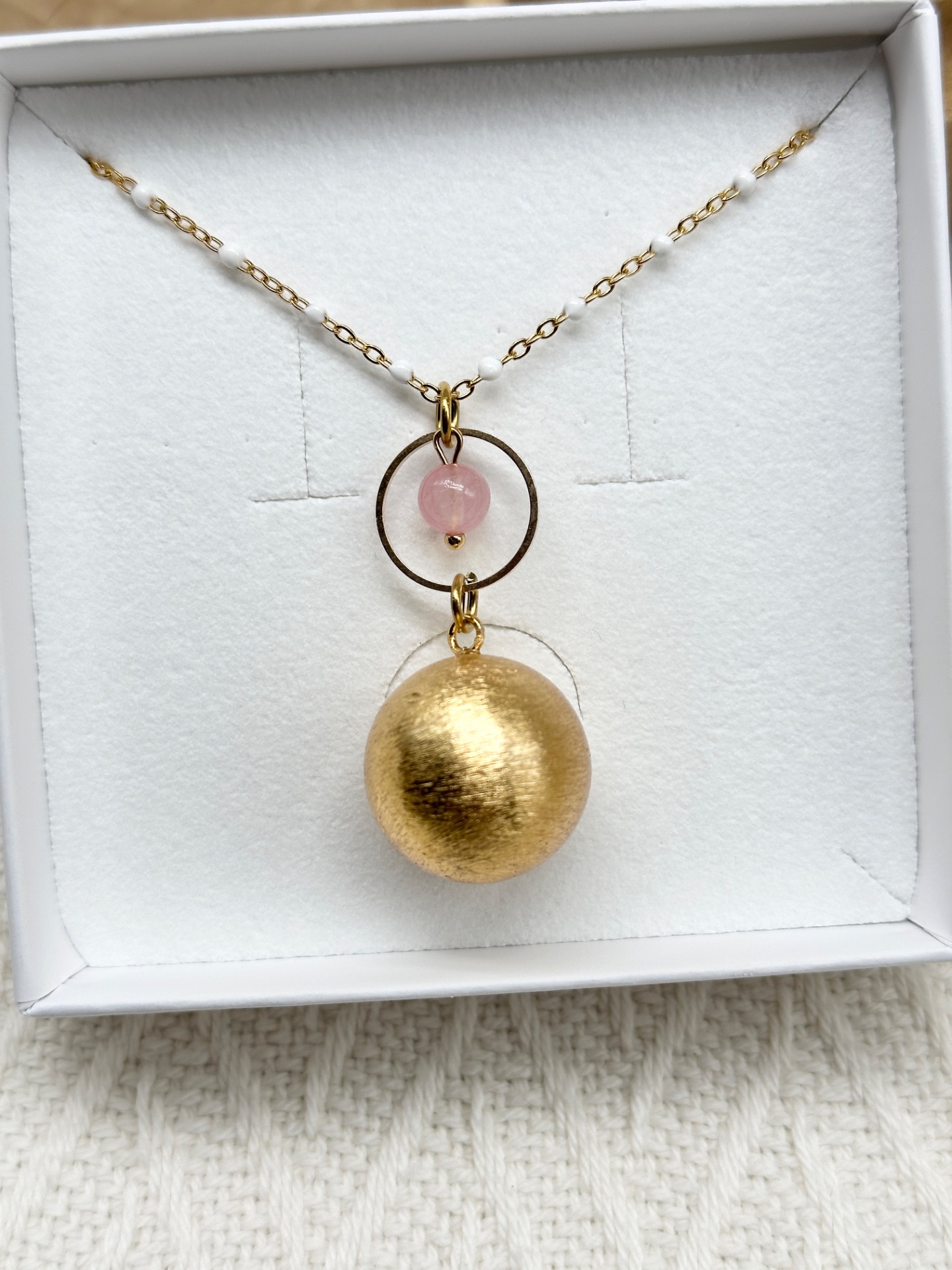 Bola de grossesse Or (brossé ou lisse au choix) accompagné d'un discret anneau et d'une pierre fine positionné à l'intérieur au choix parmi près de 15 pierres (notre "Guide des pierres" est disponible dans les photos pour voir la couleur de chaque pierre et ses vertus).